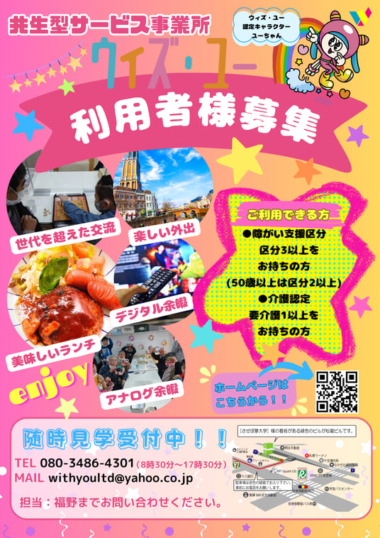 29日 5月 2025 メンバーさん募集中!! 再度、利用者様募集中のチラシを配布しています(^^♪ ホームページにも随時、空き情報の更新を行っています。 是非是非、気になった方は、ウィズ・ユーまでお問い合わせください☆彡 お問い合わせ先はここから♪ 今後も、利用されるメンバーさんの生活の質の向上を目指して、色々な企画をしていきます☆彡 新しいメンバーの一員になりませんか?? 尚、ウィズ・ユーの利用対象者は以下の方々になります(^^)/ ご連絡お待ちしています(^▽^)/ tagPlaceholderカテゴリ: